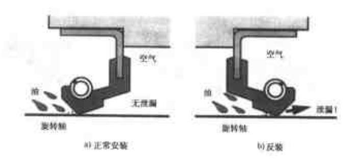 當(dāng)正向安裝時,滿足密封側(cè)坡度較陡,泵送作用可以實現(xiàn)密封;反向安裝不滿足,靜止式不泄露,運(yùn)轉(zhuǎn)時泄漏。