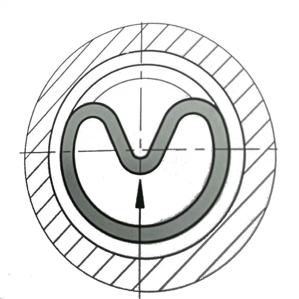 1.把彎曲后的密封圈放入溝槽內(nèi),并沿箭頭方向?qū)⑵渑?形圈(如下圖)