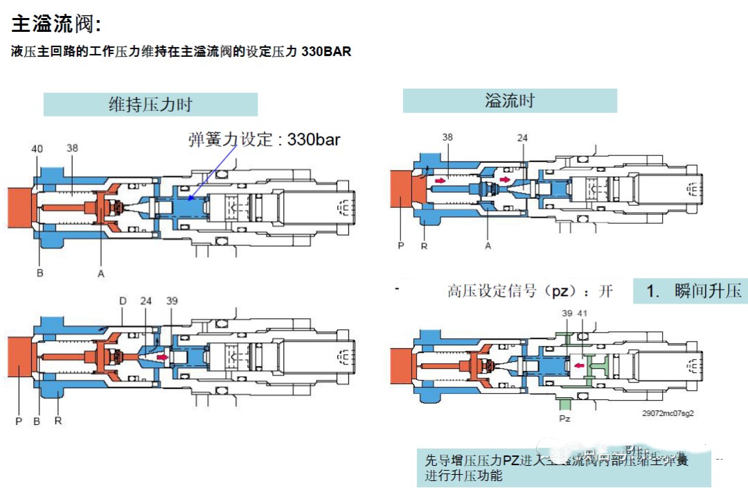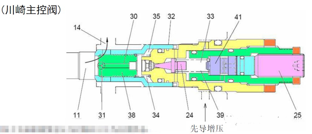 動力增壓時,通過先導(dǎo)增壓油道流入的壓力(增壓用先導(dǎo)壓力),通過側(cè)面的油路流入活塞(41)的側(cè)孔,推壓活塞(41),使彈簧(39)的設(shè)定壓力上升。