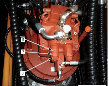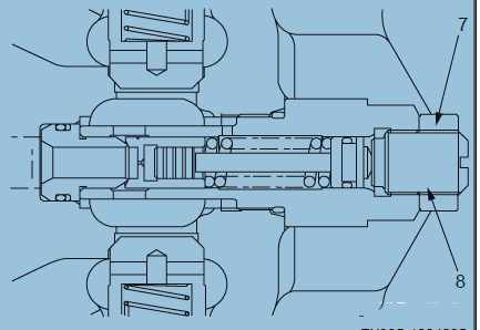 ● 如果回轉(zhuǎn)溢流壓力不正常,按下列順序調(diào)整回轉(zhuǎn)馬達(dá)安全閥(6)。