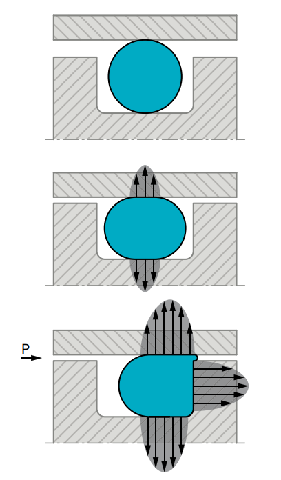 O形圈是一種雙向密封元件。安裝時(shí),O形圈徑向或軸向的初始?jí)嚎s量決定了O形圈的初始密封能力。系統(tǒng)壓力作用于O形圈所 產(chǎn)生的力,就是其總的密封力;該密封力隨著系統(tǒng)壓力的升高 而增大。在壓力作用下,O形圈的形狀和具有高表面張力的液體相仿,壓力朝各個(gè)方向等值傳遞。