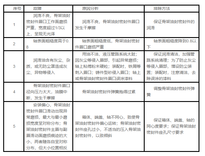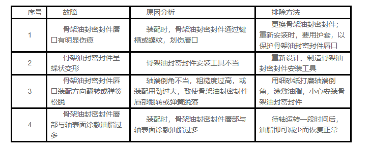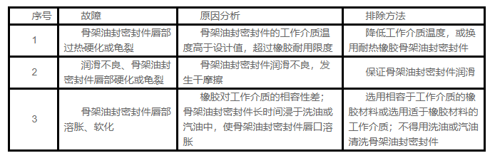 在有效使用期限內(nèi),微量的泄漏是允許的,否則,必須按照下述骨架油封密封件的常見故障原因及排除方法進行處理。