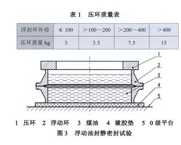 可以采用如圖方法,將成對清潔的浮封環(huán)對合好放在 0 級平臺,底部可加橡膠墊或涂油脂,頂部加上配重的壓環(huán),倒入適量煤油,要求 10 min 浮封環(huán)面不得有泄漏和滲油。壓環(huán)的質(zhì)量可參考下表。