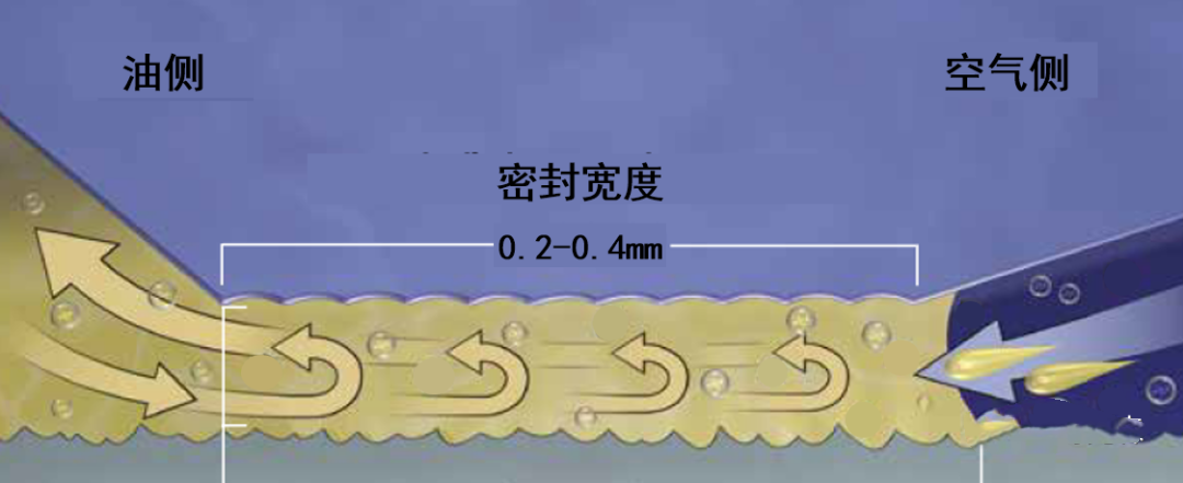 如圖1所示,在密封系統(tǒng)中起到密封作用的區(qū)域就是密封唇口與軸配合的這一段,通常寬度在0.2-0.4mm之間。油封的密封唇口采用非對(duì)稱壓力分布,油側(cè)的α角大于空氣側(cè)的β角,油液在毛細(xì)作用下流入密封唇口區(qū)域,隨后在泵送空氣的作用下,流回到減速箱內(nèi),在密封唇口形成動(dòng)態(tài)平衡的油膜(圖2),保證潤(rùn)滑的同時(shí)也可以及時(shí)帶走摩擦產(chǎn)生的熱量。