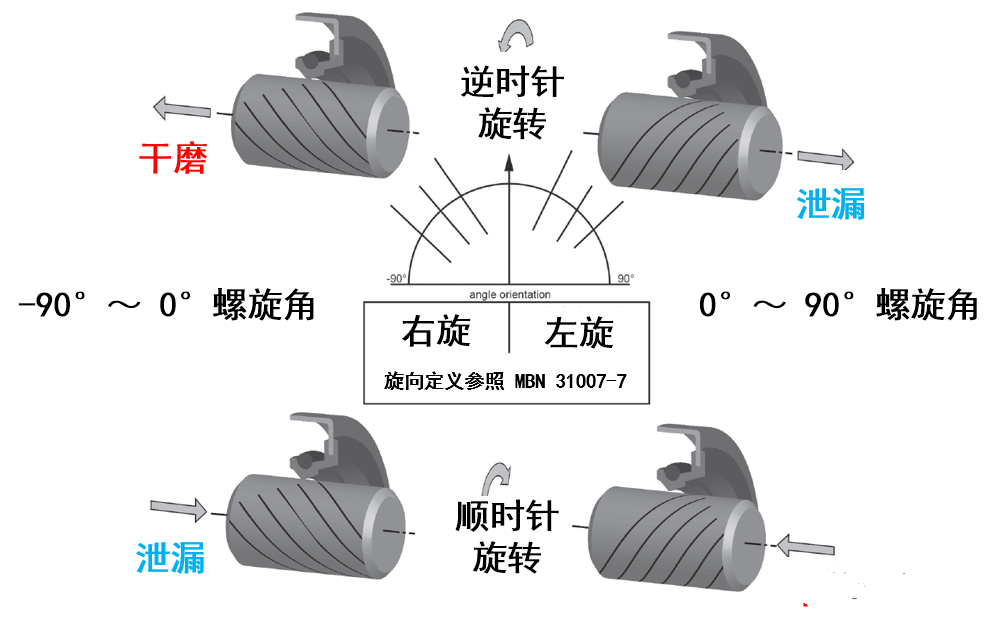 具體是泄漏還是干磨,取決于螺旋紋的方向和軸的旋轉(zhuǎn)方向,可以借助圖3來理解和記憶: